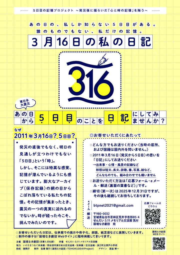 本プロジェクトは、発災の直後でもなく、明日への見通しが立つわけでもない「5日目」という時に着目し、一人称のライティングヒストリーとも言える「日記」という手法で、これまでのアーカイブの網の目からこぼれ落ちてきた記憶を掬い、表現の手法で震災の一つの真実に迫ろうという新たな試みです。